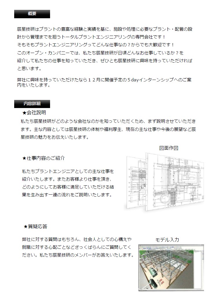 辰星技研の概要や部署ごとの仕事内容についてご説明後、様々な疑問やご質問にお答えいたします。