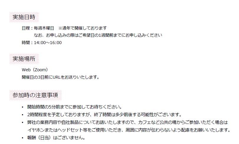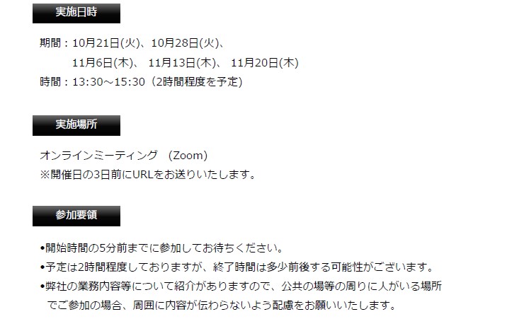 ・企業情報についてお話いたしますので、カフェなど公共の場からご参加いただく場合は、周囲に内容が伝わらないようご配慮をお願いいたします。